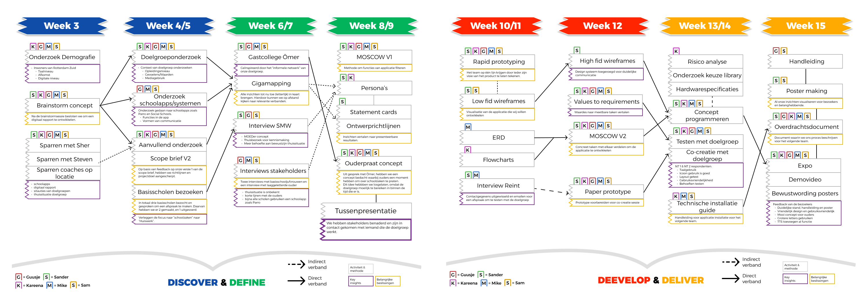 Als team hebben we de dubble diamond methode aangehouden voor ons ontwerpproces. Ik kwam door nieuwe werkvormen en gesprekken met stakeholders achter nieuwe inzichten voor ons product. Hierdoor hebben we ons product kunnen itereren op basis van gegeven feedback van de doelgroep, stakeholders en experts.